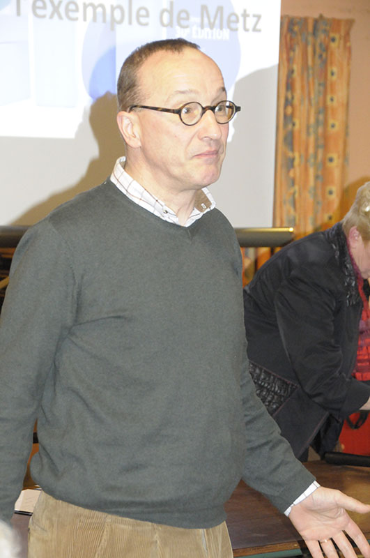 Il a ensuite passé la parole à Dominique Trimbur, professeur d’histoire et directeur adjoint de l’ensemble scolaire Jean XXIII pour la conférence annoncée : Destruction des monuments classés ou inscrits au cours des Trente Glorieuses à Metz : quartier des Roches et Hôtel de Perpignant Gronais. Un titre prometteur…