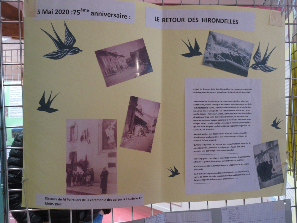 Des panneaux racontaient les événements majeurs des expulsés qui se sont retrouvés en Aude. On y a reconnu des photos qui avaient été projetées à Lorry-lès-Metz où l’on reconnaissait Gabriel Poiré, le président du Groupement des Expulsés de Lorraine et d’Alsace et des Réfugiés de l’Aude. Le lien est simple : Paulette Boulier (19 ans en 1944), mère de Bernadette Klein, était secrétaire au bureau des réfugiés à la préfecture, dans le service des Expulsés de Monsieur Béna (de Metz) où travaillait aussi Gabriel Poiré comme traducteur. Elle portait souvent des plis à l’École d’Agriculture de Carcassonne ou chez des particuliers. On ne lui a jamais rien dit de la teneur de ces courriers, mais elle était sure que c’était dangereux. Pourquoi l’École d’Agriculture ? Parce que cette école, où il y avait un groupe de jeunes Lorrains de Château-Salins, collectait les sacs vides de pommes de terre des Carcassonnais (chaque sac avait un patronyme écrit dessus) et allait les remplir auprès d’autres écoles d’agriculture de la région ! Est avis qu’il ne voyageait pas que des patates avec les sacs !