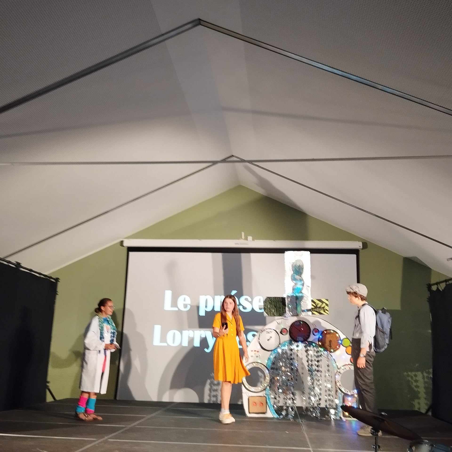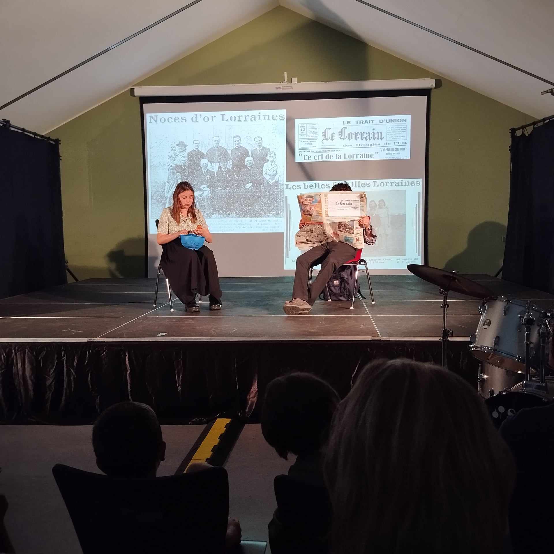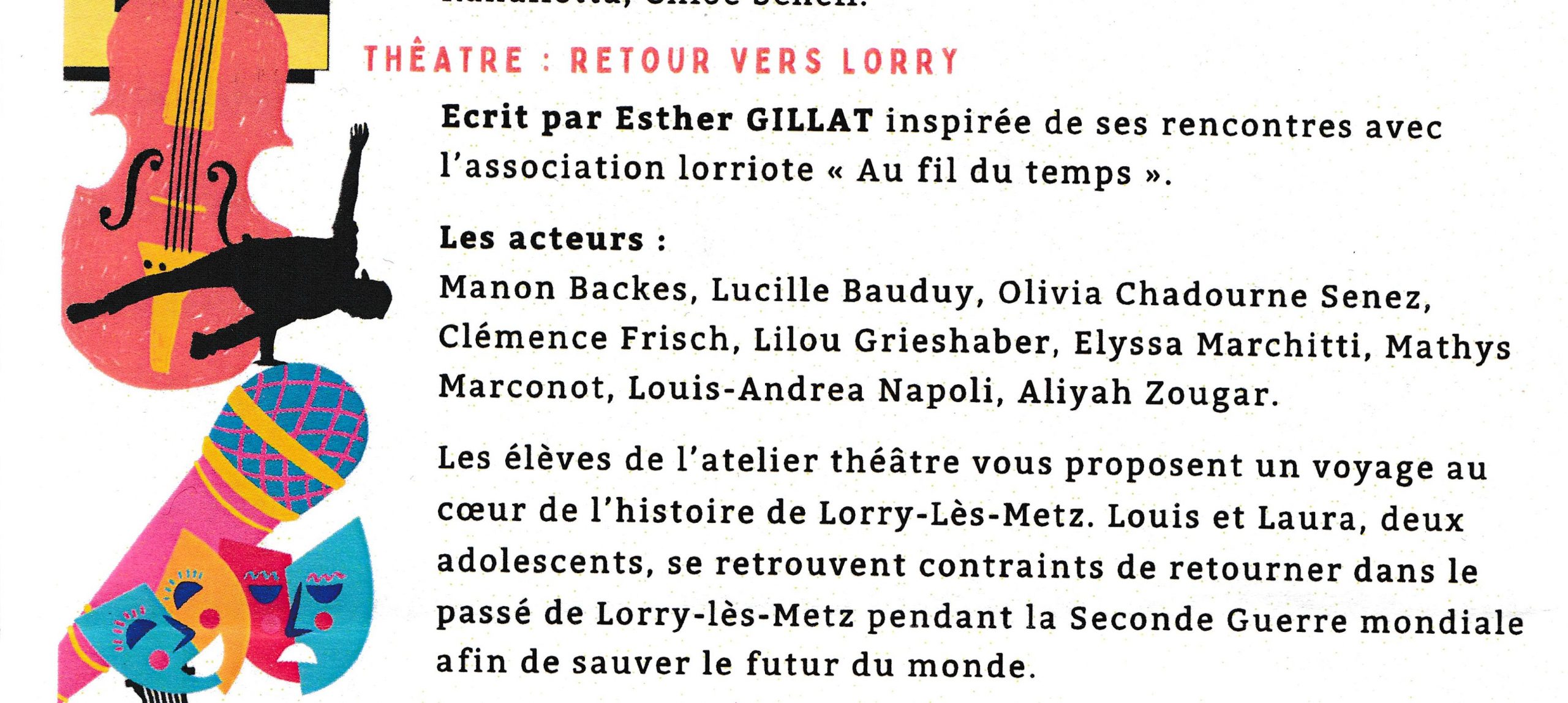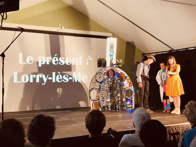 Dix-neuf de nos membres de Lorry-lès-Metz « au fil du temps » étaient présents à l’Espace Philippe-de-Vigneulles pour assister à une pièce de théâtre présentée par l’Aldam dans le cadre du Festival des Arts. Nous avons pu apprécier la qualité du travail d’écriture du scénario inspiré des rencontres avec notre association, ainsi que les textes et les décors réalisés en peu de temps par les élèves de la classe de théâtre dirigée par Esther Grillat. Autour du thème « Retour vers le futur », la mise en scène des aventures de 2 jeunes Lorriots utilisant une machine à remonter le temps, s’est librement inspirée du vécu de quelques habitants durant la période de l’annexion allemande. Le jeu des 9 acteurs âgés de 6 à 14 ans a été complété par les témoignages vidéo et audio de Maurice Vigneron, Gisèle Guthmuller, et Anne-Marie Cholley. Patricia Lallier a mis la metteuse en scène en relation avec les Anciens du village pour les récits, Claudine Kester-Elghozi et Gérard Kester ont eu plaisir à accompagner le projet lors de la relecture du scénario et de la mise à disposition de photos anciennes. Charles Scherer, le président de l’Aldam, et Esther Grillat ont salué le partenariat avec notre association. Un grand merci pour ce moment agréable et nos félicitations à toutes et tous !